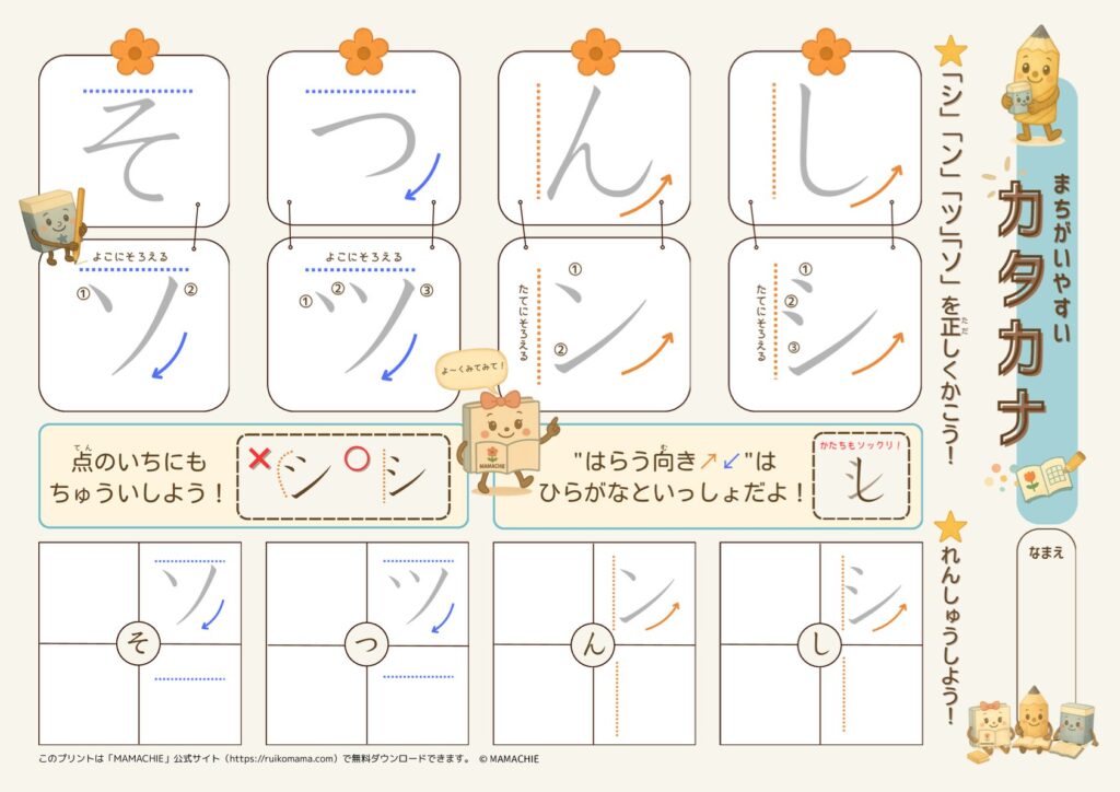 間違いやすいカタカナ「シ・ソ・ツ・ン」練習プリント